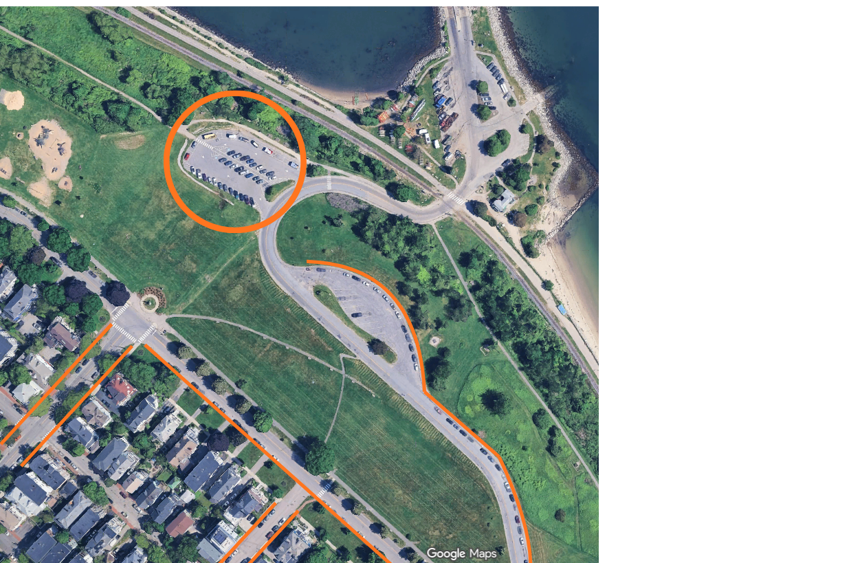 All parking around our site is free and most (but not all!) spots have no time restrictions during the daytime. The image shows the areas (in orange) where all-day parking is available. The lot halfway down Cutter Street that is circled is generally the best place to park, but when that lot is full there is street parking along Cutter Street and most residential streets in the neighborhoods nearby.