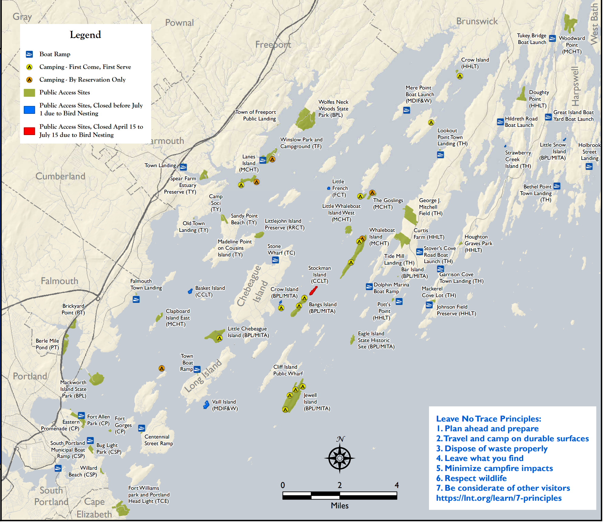 Maine Coastal Public Access Guide: Thorough information on ALL public access points on the Maine coast. Download PDFs for specific sections of the coast to see all boat launches, public beaches, etc.- Casco Bay Public Access by Boat Map: A map (almost fully up to date) showing all shorelines on Casco Bay that are open to the public. (Source: Maine Coast Heritage Trust).